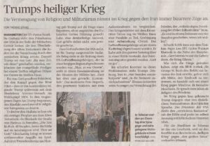 Gerade heute wird diese Auslegung hundertfach bestätigt. Ganz gleich, ob es um die Mullahs (eifernde Schiiten), die Moslembrüder, die Wahabiten, um die Evangelikalen, um die Piusbrüder oder die „arbeitslosen“ orthodoxen Juden handelt – überall trifft man auf Bewegungen, die Freiheitsrechte von Menschen einschränken, Konflikte provozieren und Kriege auslösten/auslösen und weiterhin auslösen werden. Da gehen Sikhs und Hindus auf Moslime los (und umgekehrt), da prügeln sich Schiiten mit Sunniten, da werden Christen von Muslimen niedergemacht, da attackieren extremistische Syrer Drusen und Kurden. Da geht Putin ein Bündnis mit dem russisch-orthodoxen Partriarchen Kirill I. ein und ein Verbrecher wie Trump stilisiert sich zum Botschafter und Vollstrecker Gottes (s. unten stehenden Beitrag). Und das alles im Zeichen von Lüge, Missbrauch und menschenrechtsverachtender Missionierung (das ist nur die Spitze des Eisbergs – siehe Afrika!).