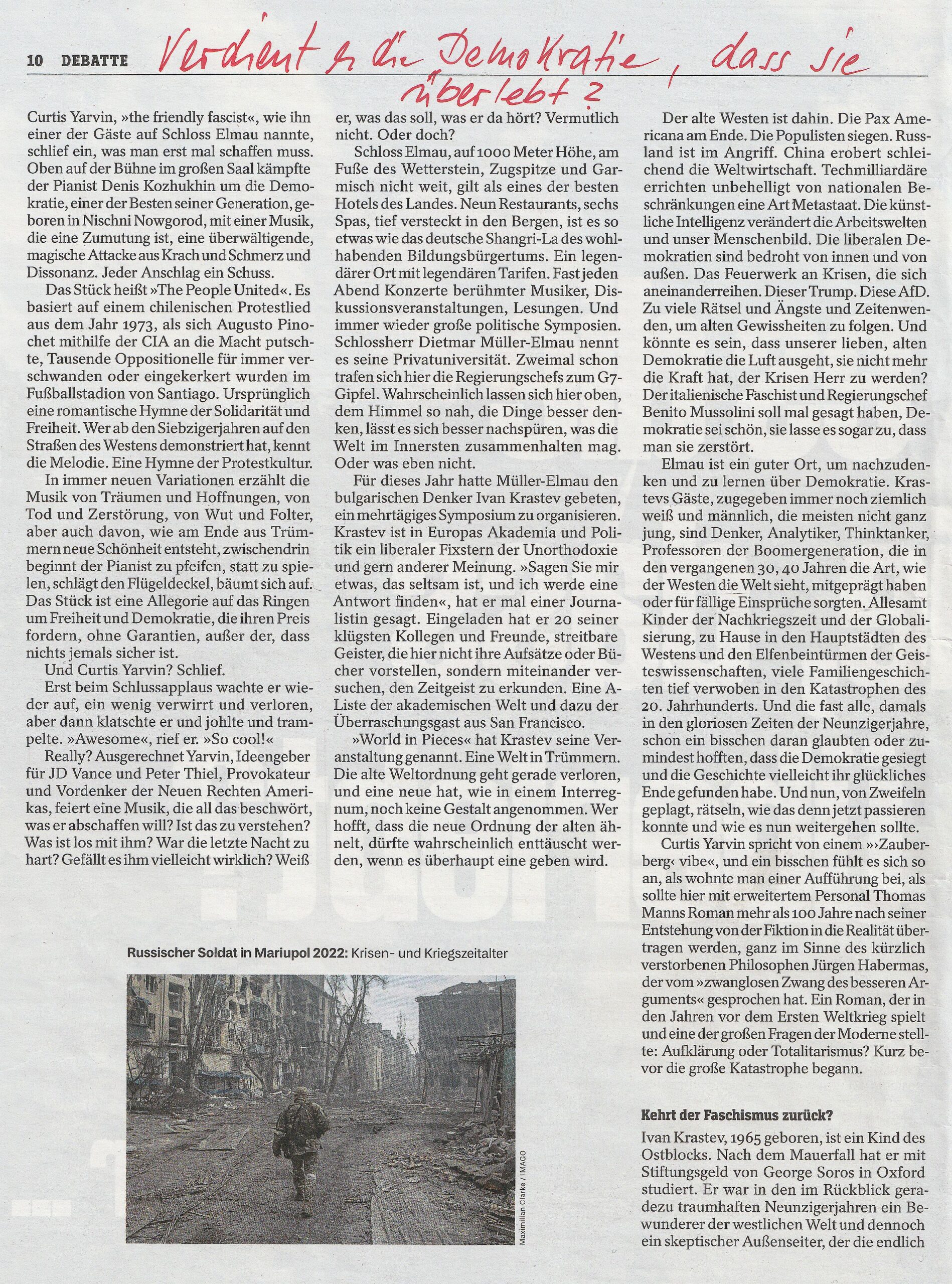 Im österreichischen Elmau haben sich kürzlich „denkende Geister aller Couleur“ zusammengefunden, um sich des Themas „Demokratie“ gnadenlos anzunehmen. Was dabei herauskam, ist dem beigefügten Kasten zu entnehmen.