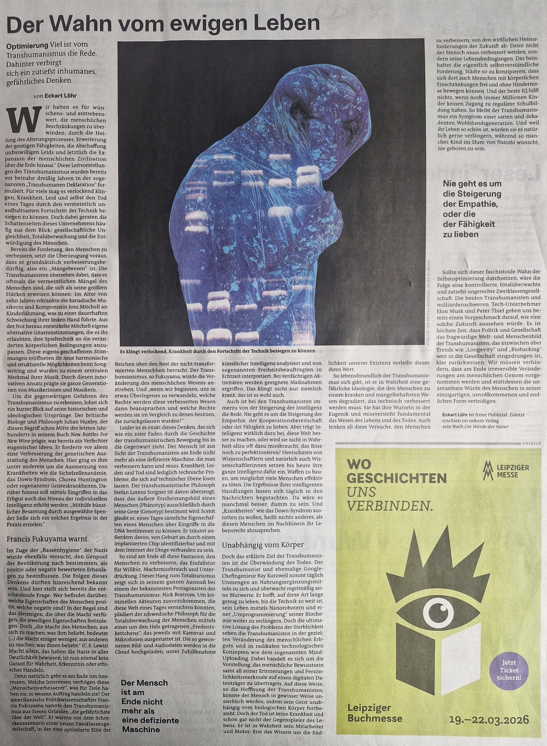 Wer glaubt, dass solche Forschung darauf aus ist, Freundlichkeit, Kooperationsbereitschaft oder Friedfertigkeit festzuschreiben, irrt natürlich. Ethische Grundsätze sind hier bewusst ausgeklammert. Wie auch sollte Moral eine Rolle spielen, wenn Eliten sie bewusst abstreifen wollen? Ganz recht:  Auch hier könnten/dürften/würden neue Wagenburgen entstehen. Auch hier läuft die Gesellschaft Gefahr, einmal mehr auseinander zu fallen. Eckard Löhr ruft dann auch dazu auf,  den Langlebigkeitsexzessen entgegenzutreten. Wie aber? frage ich da. Bremsen könnten da nur mächtige Kräfte und die ….